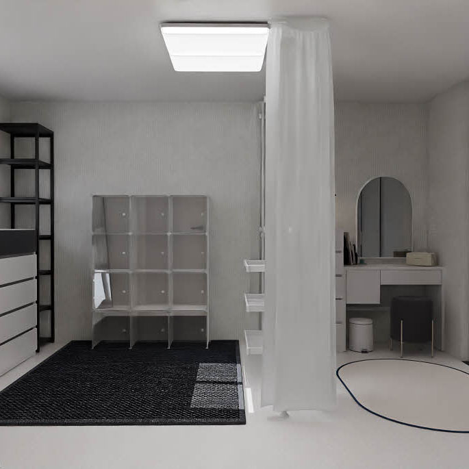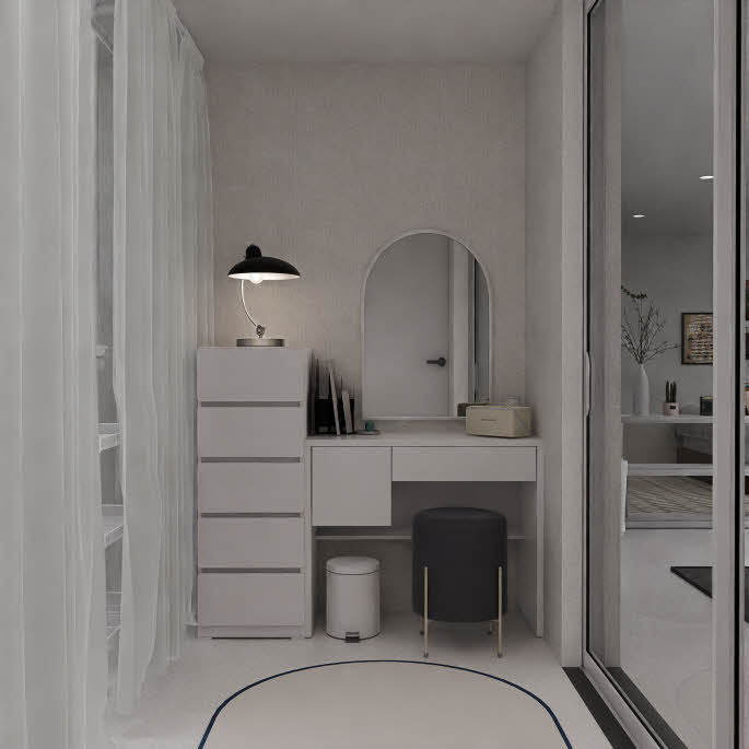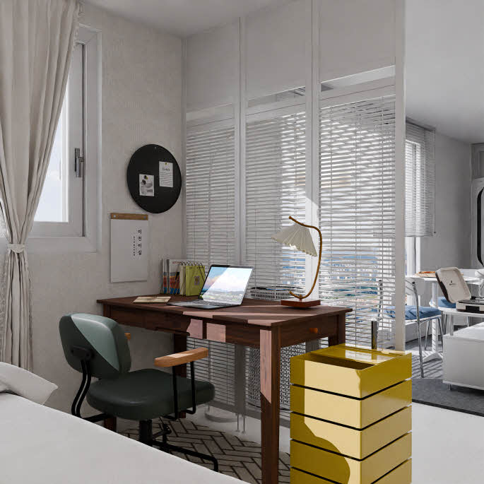 부엌은 개방감을 극대화하기 위해 유리문을 가리지 않고 배치해, 탁 트인 느낌을 살렸습니다. 기존 침실 공간을 옷방과 화장대로 바꾸고, 침실은 거실 한켠에 따로 분리해 두었습니다. 침실은 아늑하고 차분한 분위기를 위해 우드 소재의 가구와 화이트 컬러를 사용해 다른 공간과 차별화했습니다.