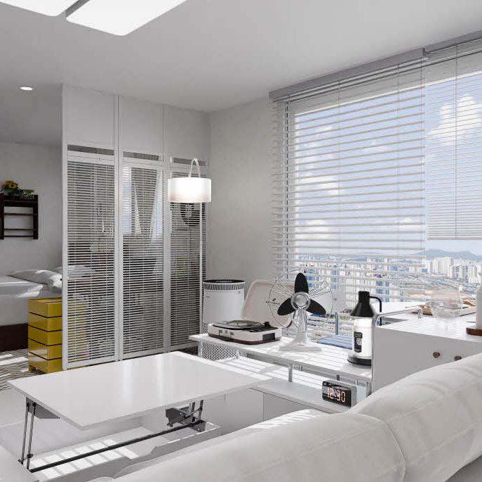 거실은 방, 주방이 하나로 연결된 원룸 형태로 구성했습니다.