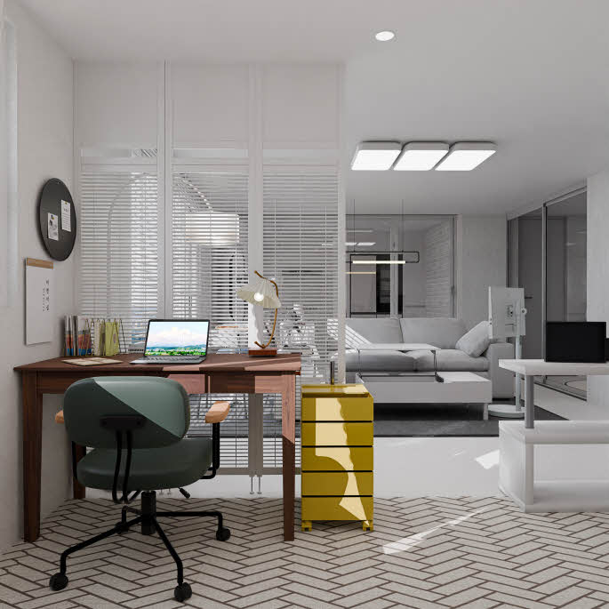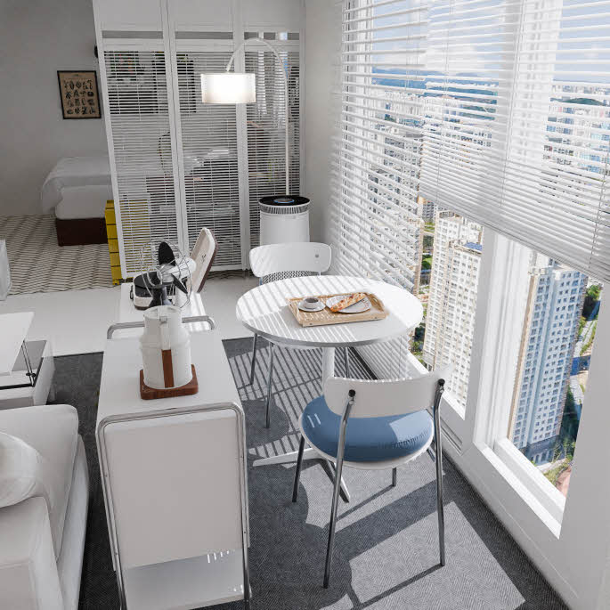 거실은 방, 주방이 하나로 연결된 원룸 형태로 구성했습니다. 친구, 가족, 직장 동료 누구든 자연스럽게 대접할 수 있는 카페 같은 분위기를 연출하며 이동식 스마트 TV를 배치해 어디서든 편안하게 OTT 콘텐츠를 즐길 수 있도록 했습니다.