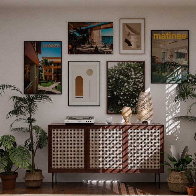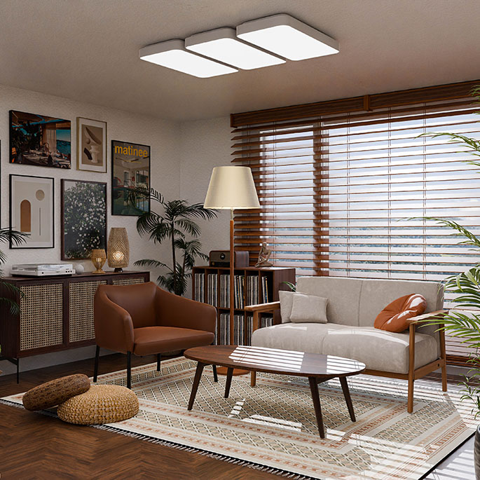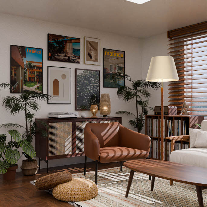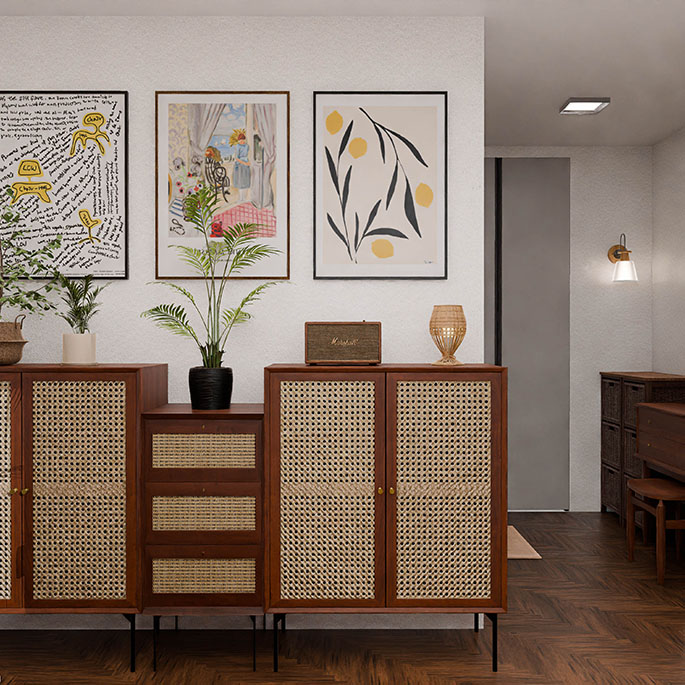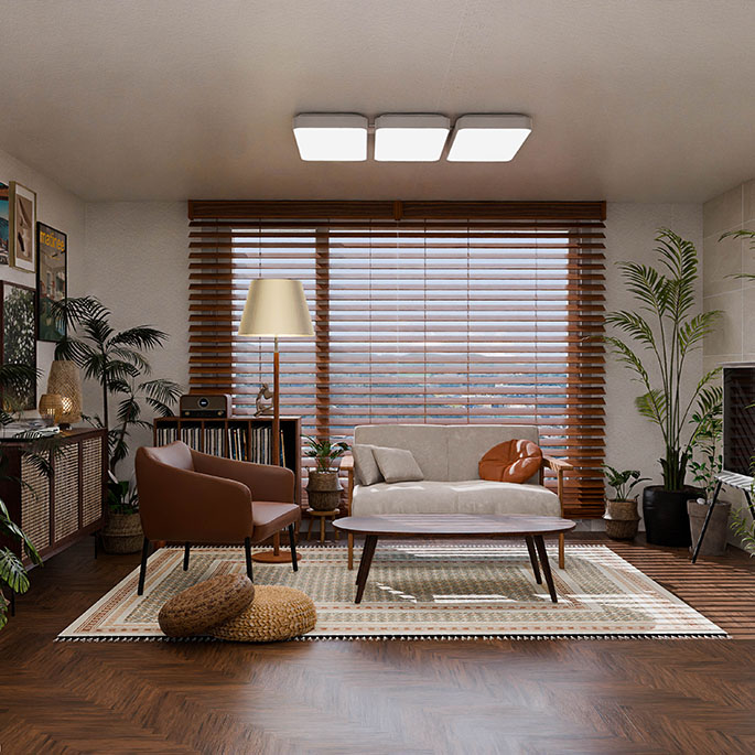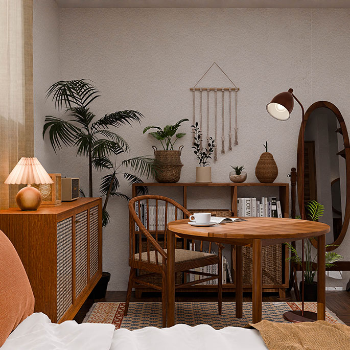 집에서도 휴양지에서 쉬는 것 같은 편안함을 느낄 수 있도록, 원목과 라탄을 활용해 이국적인 분위기를 표현했습니다. 우드톤으로만 구성된 인테리어가 답답하게 느껴지지 않도록 적절히 식물을 배치하여 싱그러운 컬러감을 더했으며, 이국적인 분위기를 한층 더 강조하는 포인트로 활용했습니다.