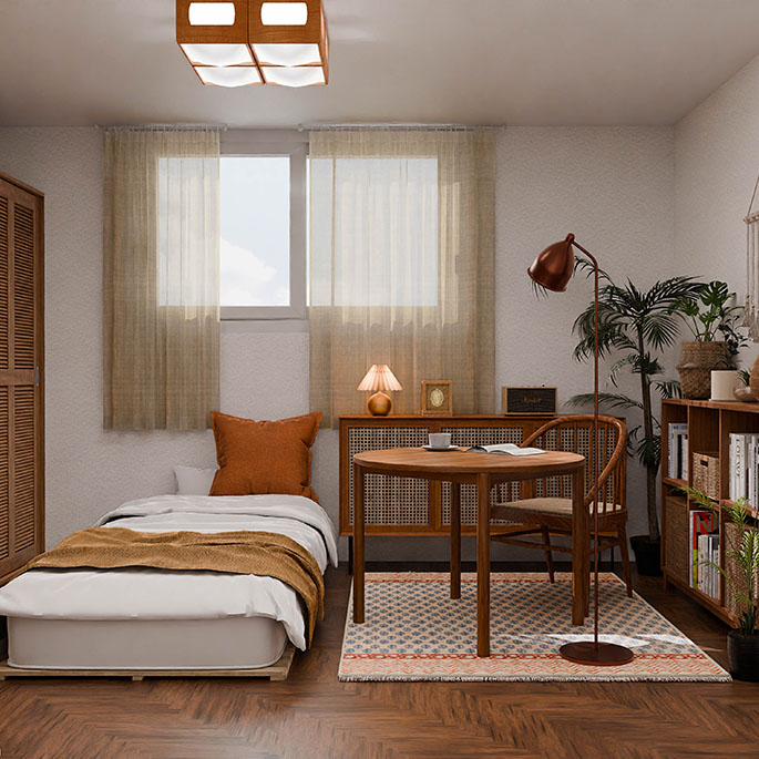 방 2는 따뜻한 색조를 활용해 포근한 자연의 느낌을 담아낸 아늑하고 실용적인 개인 공간으로 꾸몄습니다. 이 방은 주로 개인적인 시간을 보내며 마음의 안정을 찾는 공간으로 활용할 수 있습니다.
