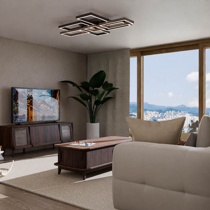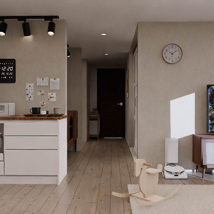 거실은 가족들이 함께 즐길 수 있는 유희거리가 가득한 놀이터입니다. 보드게임, TV(게임기, 영화 감상 등), 그리고 막내를 위한 놀이 책상이 마련되어 있어, 사춘기가 될 아이들이 각자 방에 틀어박히지 않고 거실에서 가족과 함께 시간을 보내길 바라는 저의 소망을 담았습니다.
