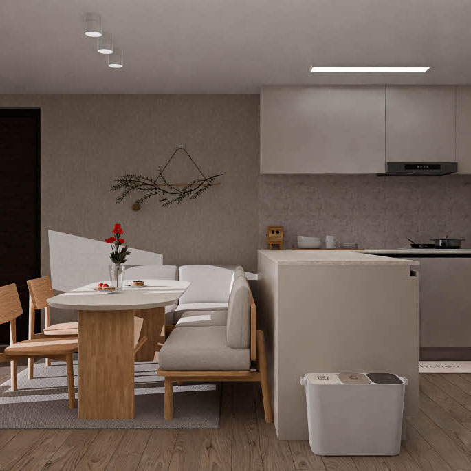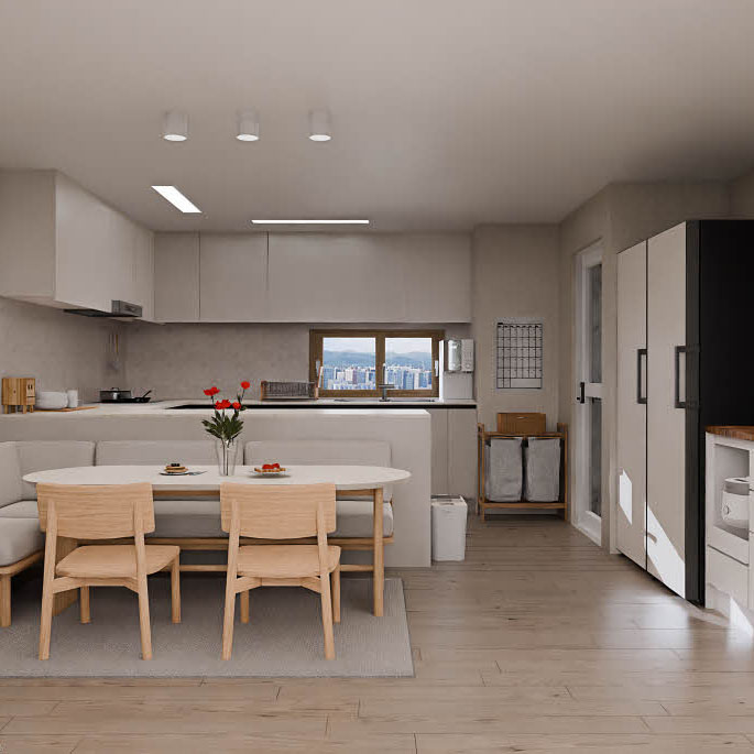 부엌은 항상 깨끗하게 정돈되어 있으며, 오직 식사와 휴식에 집중할 수 있는 공간으로 구성했습니다. 쇼파형 식탁을 두어 카페처럼 두런두런 이야기를 나눌 수 있도록 했습니다.