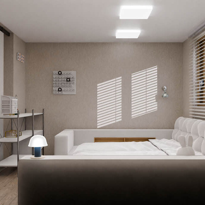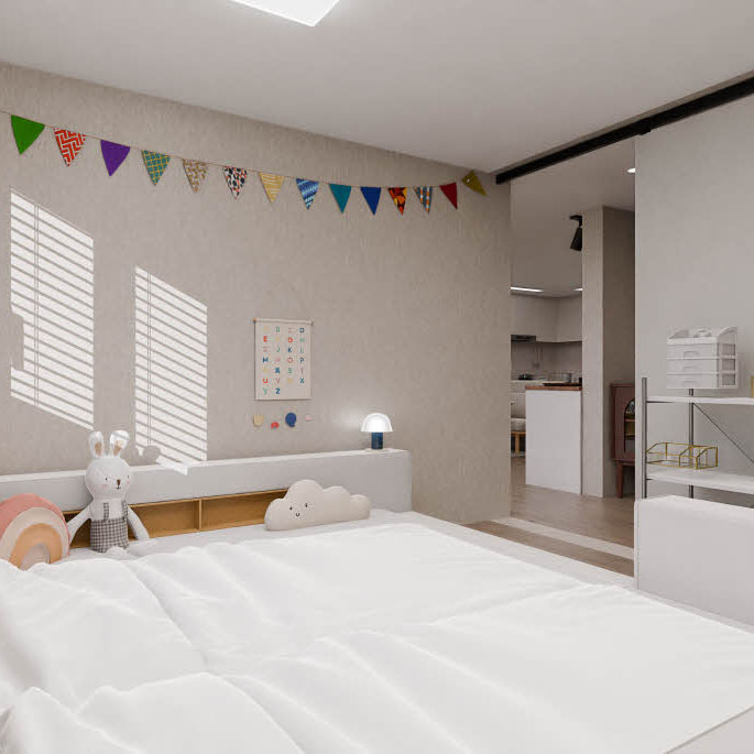 첫번째 자녀의 방은 휴식과 수면 공간으로, 영유아와 학생인 자녀들이 함께 생활할 수 있도록 구성했습니다. 화이트 색감을 사용하고 가구를 최소한으로 넣어, 휴식을 취하기 좋은 공간으로 꾸몄습니다. 특히 저상침대와 영유아용 인형, 가랜드 등을 활용해 어린 자녀와 초등학교 고학년인 자녀가 함께 사용할 수 있는 공간으로 만들었습니다.